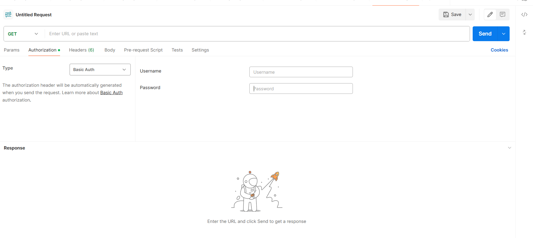 Step 2: Now navigate to Authorization in Type, click on the drop down and select Basic Auth enter the username and password.