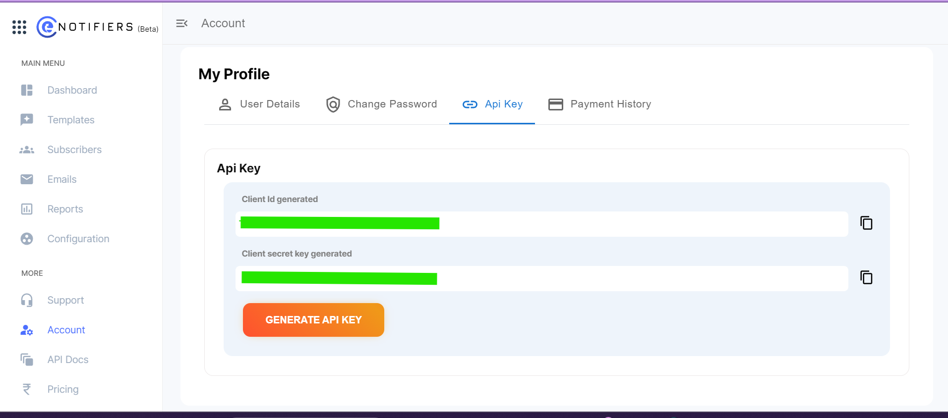 Step 2: In My profile section navigate to Api key section, click on generate API key. Client id and client secret key are generated and displayed on the screen.