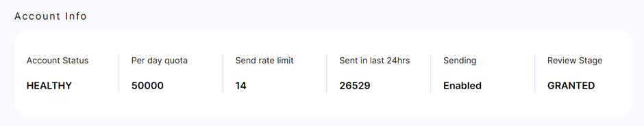 Managing your email marketing account effectively requires a thorough understanding of various account parameters and metrics. These parameters help ensure your campaigns run smoothly, within the limits set by your email service provider, and comply with best practices. This guide will cover the key components of your account information, including account status, per day quota, send rate limit, sent in the last 24 hours, sending, and review stage.